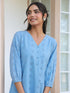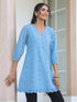 - Keep it cool and classic with this pure cotton light blue schiffli-embroidered tunic. Featuring a flattering v-neckline, fabric button detailing on the front, and delicate schiffli embroidery throughout, this piece blends everyday ease with timeless charm. The scalloped hem and 3/4th balloon sleeves add soft feminine detailing, making it perfect for workdays, errands, or relaxed weekend outings.