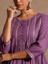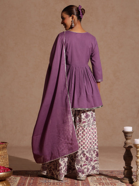 - Infuse elegance into your ethnic collection with this purple sharara set from janasya. Crafted in soft cotton, the peplum-style top features a round neck adorned with silver lace and vertical gota patti accents, complemented by gathered detailing for a flattering silhouette. The three-quarter sleeves and hem are finished with delicate gota lace. It is paired with a beautifully floral printed 2-tier sharara, designed with a fully elasticated waist for ease of wear, and the gota lace is added for the festive charm. A solid purple cotton dupatta enhanced with lace edging completes the set. Pair this ensemble with silver chandbalis and a dainty maang tikka for festive charm.