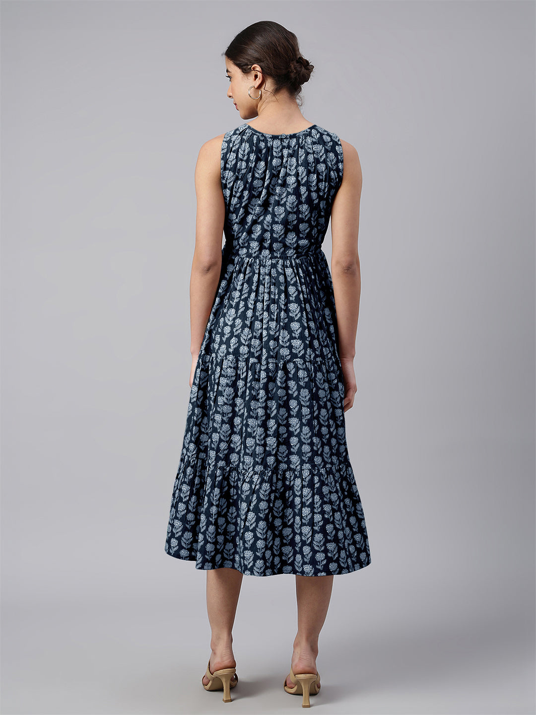 - Elevate Your Wardrobe With This Black Cotton Floral Printed A-Line Dress. It Features A Round Neck And A Sleeveless Design With A Button And Loop Closure At The Back. Adorned With Blue Floral Prints, The Dress Boasts A Flared Tiered Skirt And A Waist-Cinching Tie-Up Detail, Making It Both Stylish And Comfortable For Casual Outings.