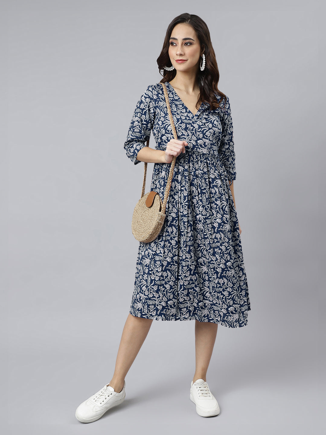 - Step out in style with this indigo cotton floral printed angrakha dress. Featuring a timeless wrap-style neckline and a waist tie-up for a flattering fit, it’s designed to complement every occasion. Delicate ruffles at the waist add a playful touch, while the vibrant indigo floral print enhances its charm, making it a perfect blend of elegance and comfort.