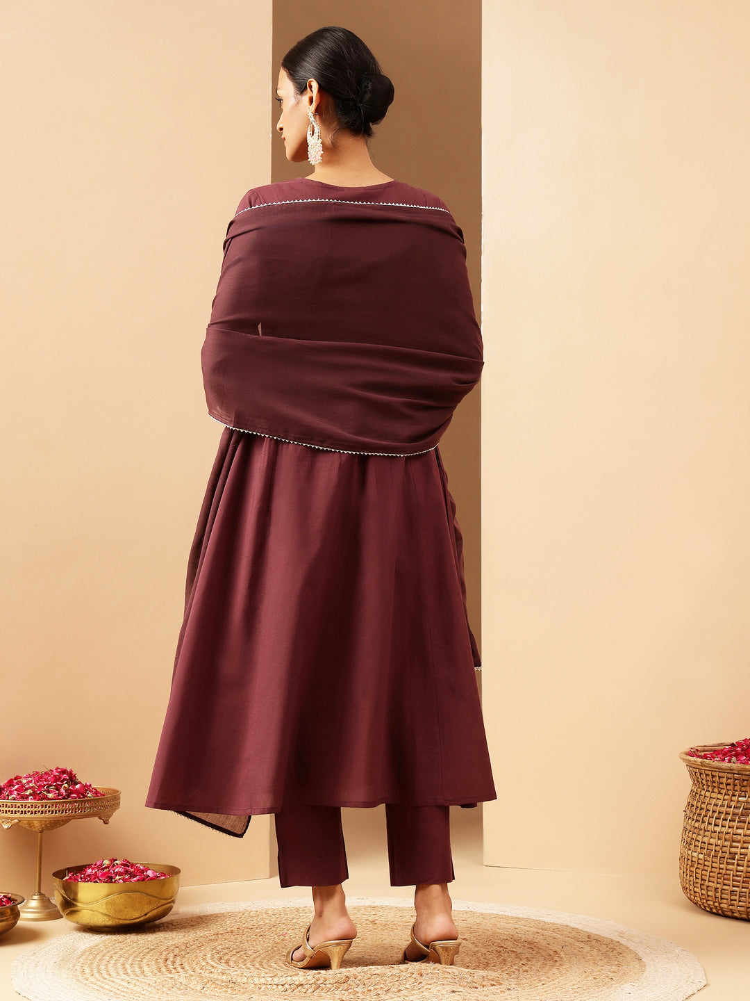 - Step into festive elegance with this burgundy a-line kurta set from Janasya, crafted in breathable cotton fabric. The kurta features a refined notch neckline, adorned with exquisite thread embroidery and intricate gold dori detailing in floral motifs that gracefully enhance the yoke. Kurta also features the mirror work and sequins detailing along with the thread and dori embroidery, to add a festive flair to the ensemble. Delicate gathers that flows from the bust, creating a flattering silhouette. The three-quarter sleeves are finished with matching thread and dori embroidery on the hems. Paired with a solid burgundy narrow pant, designed with a semi-elasticated waist for comfort. A matching cotton dupatta with subtle lace border completes the ensemble. Style with pearl chandbalis and a statement cocktail ring for a graceful festive look.