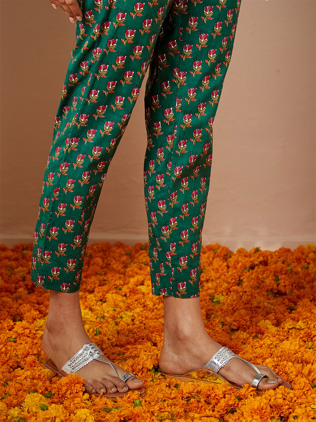 - Step into effortless elegance with this gorgeous green pure cotton anarkali set from janasya. Designed for the woman who loves timeless style with a hint of festive sparkle, this outfit is just the right pick for family gatherings, small celebrations, or cultural evenings. The flowy anarkali kurta is brought to life with soft floral prints, while the gota lace detailing on the yoke, arranged in a beautiful geometric lattice pattern, adds that little touch of shimmer and celebration. The round neckline, a side pocket and three-quarter sleeves keep it classic and comfy, while the pleated flare brings easy movement and charm to every step. Paired with matching floral printed cotton pants and a cotton dupatta that drapes beautifully, finished with elegant gota patti borders, this ensemble feels light, breezy, and festive all at once. A perfect blend of tradition and comfort, just like your favorite celebrations.