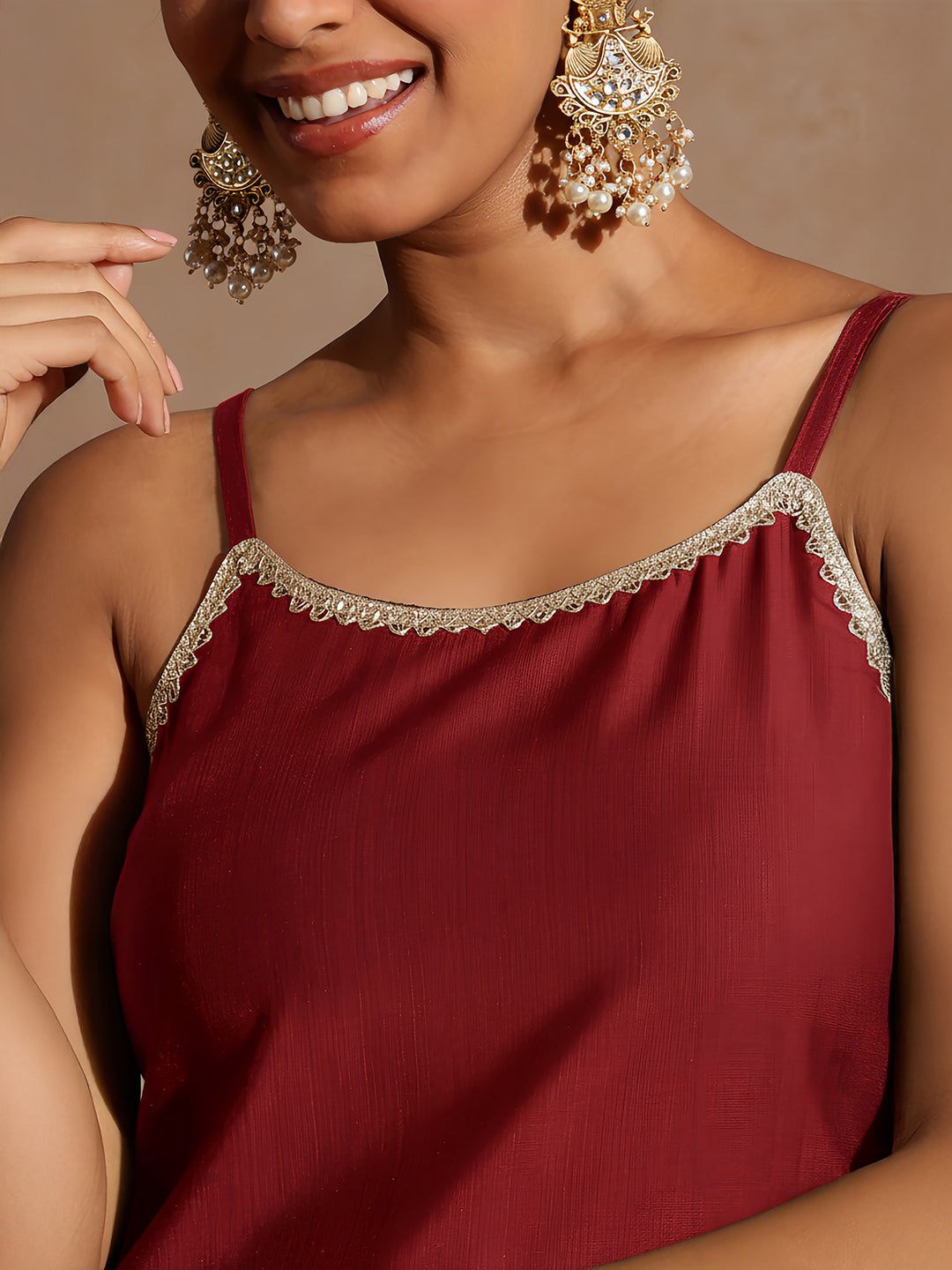 - Elevate your festive wardrobe with this elegant maroon straight kurta set from janasya. Crafted in a luxurious silk-blend fabric, the sleeveless kurta features delicate golden lace detailing along the neckline and armholes, creating a subtle shimmer. The neckline is a clean scoop design with thin adjustable straps, ensuring a comfortable and customizable fit. The kurta is paired with matching solid maroon narrow pants, designed with a semi-elasticated waistband and a functional side pocket for added convenience. Completing the look is a stunning organza dupatta adorned with intricate zari and sequins embroidery forming floral and vine motifs all over, further enhanced with a golden lace border for a rich traditional finish. Accessorize this set with statement golden jhumkas, a bold cuff bracelet, and embroidered juttis or gold heels for a complete festive look. A low bun and soft glam makeup will perfectly complement the elegant appeal of this ensemble.