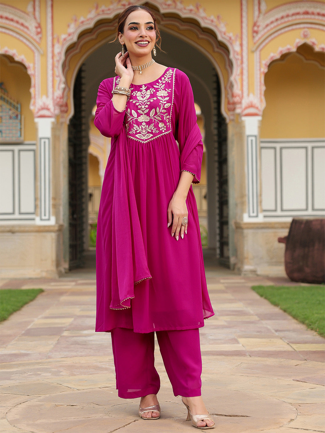 - Bring festive elegance to your wardrobe with this stunning pink georgette a-line kurta palazzo set from janasya. The kurta features a flattering a-line silhouette with soft gathers under the bust, a classic round neckline, and an intricately embroidered floral yoke embellished with delicate sequins for a touch of festive sparkle. Three-quarter regular sleeves are detailed with elegant gota patti borders and the kurta is lined with soft butter crepe for added comfort. Paired with solid georgette palazzo pants, also lined with butter crepe for a sleek drape, the ensemble is finished with a solid pink chiffon dupatta accented by subtle gota patti edging. Perfect for festive occasions, weddings, and evening gatherings, this set blends vibrant color with timeless ethnic charm.