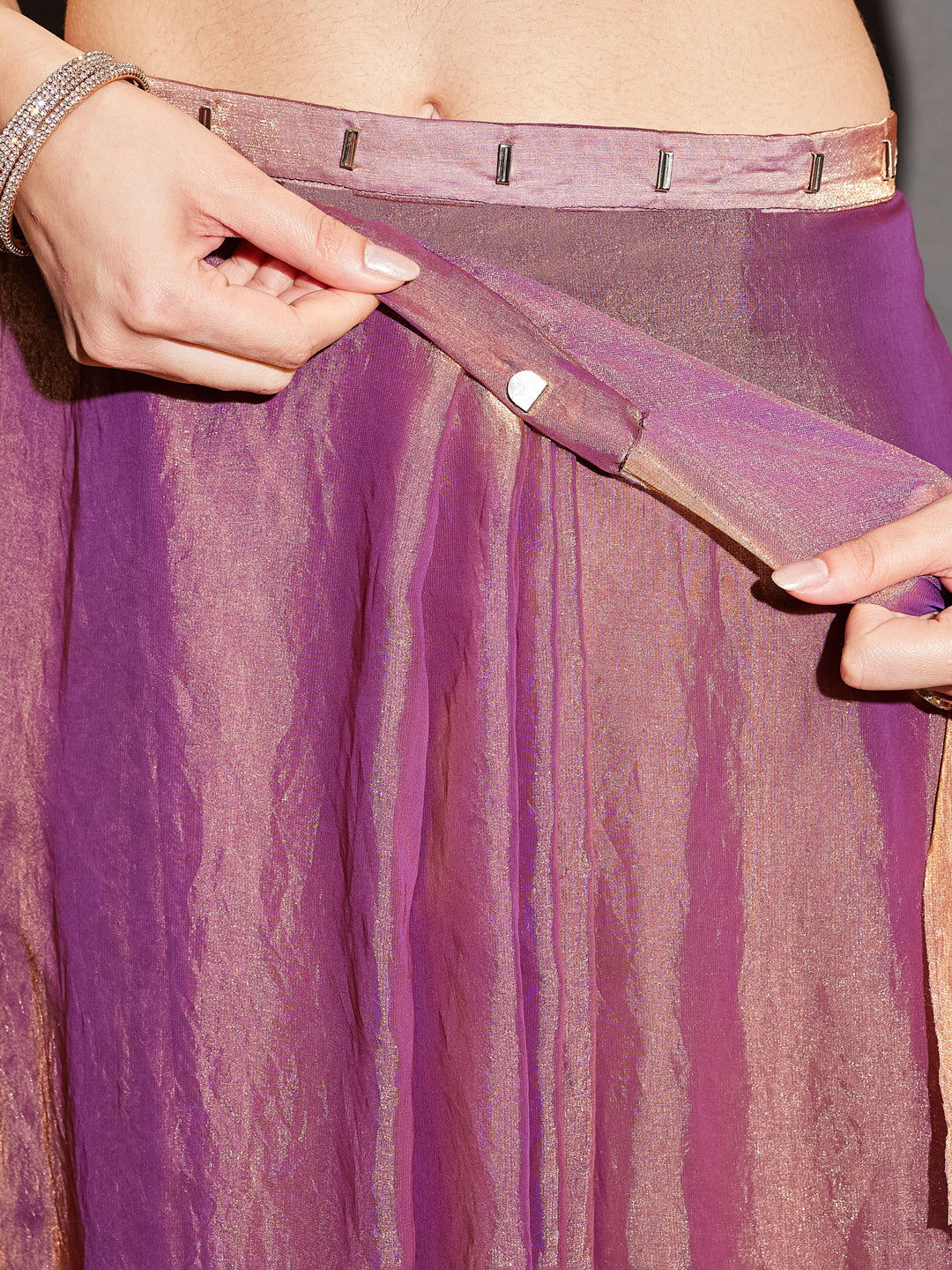 - Make a refined festive statement with this elegant double-shaded purple and gold ready-to-wear saree, crafted in luxurious tissue silk fabric. Featuring a soft luminous sheen and fluid drape, the saree showcases a rich interplay of purple and gold tones for a regal appeal. The delicately embellished border adds subtle sophistication while enhancing the graceful fall. Designed in a pre-stitched silhouette for effortless wear, this saree blends modern ease with timeless charm. Paired with a matching running blouse piece, it is perfect for weddings, festive celebrations, and evening occasions.