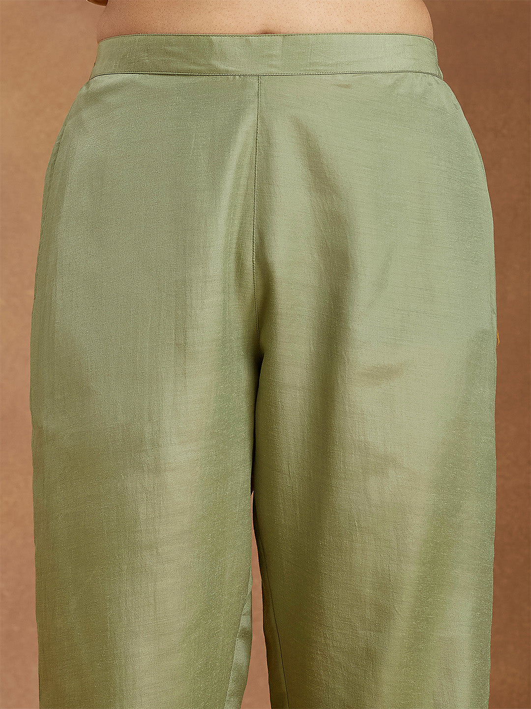 - Embrace understated elegance with this sage green silk blend straight kurta set from janasya, perfect for festive and celebratory occasions. The kurta features a round neckline beautifully adorned with intricate gold zari embroidery on the neck yoke part, highlighted by exquisite detailing that adds richness and sophistication. Delicate gold zari motifs are scattered all over the kurta, lending a subtle shimmer. The long bell sleeves finished with lace edging enhance its graceful silhouette. It is paired with matching sage green straight pants featuring a semi-elasticated mid-rise waist and a side pocket for comfort and ease. Completing the ensemble is a sage green organza dupatta with lace borders, adding sheer elegance and flow. Pair this outfit with statement chandbalis, stacked bangles, and embroidered juttis for a refined festive look.