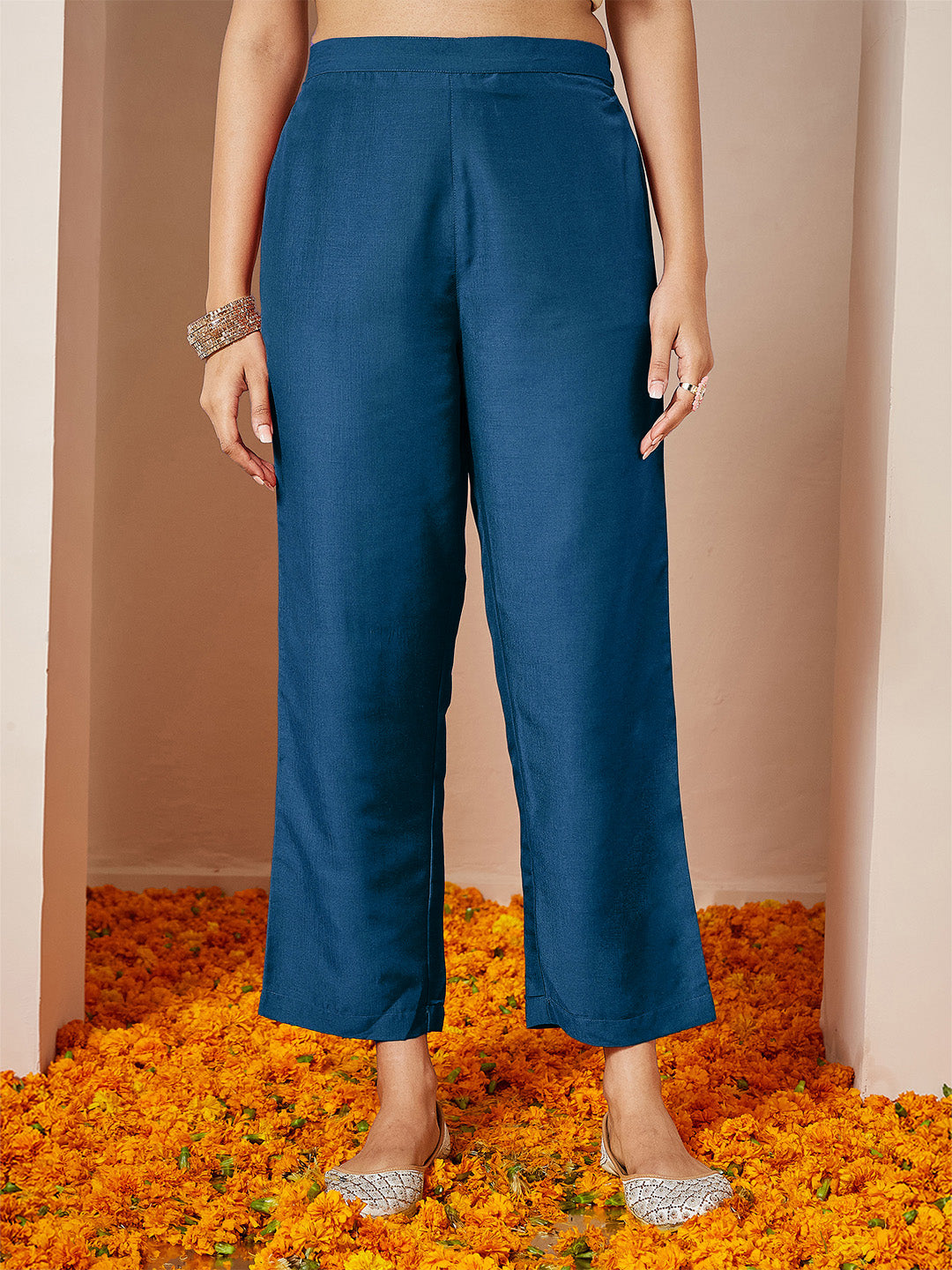 - Designed for comfort yet crafted with festive detailing, this teal blue silk blend a-line kurta set from Janasya. The kurta is adorned with all-over gold foil printed ethnic motifs that exude timeless charm, while the yoke is beautifully highlighted with intricate golden floral zari embroidery and delicate sequin accents for a subtle shimmer. A graceful notch neckline enhances its refined appeal, and three-quarter sleeves finished with gota patti borders add a festive flourish. Designed in a flattering a-line silhouette with a practical side pocket, this kurta blends utility with sophistication. It is paired with solid teal blue silk-blend straight pants for a sleek balance and a lightweight chiffon dupatta trimmed with gota patti lace along the edges, completing the look with finesse. Perfect for festive gatherings, family celebrations, or cultural occasions, this ensemble pairs beautifully with traditional jhumkas, a statement kada or bangle stack, and embellished juttis.