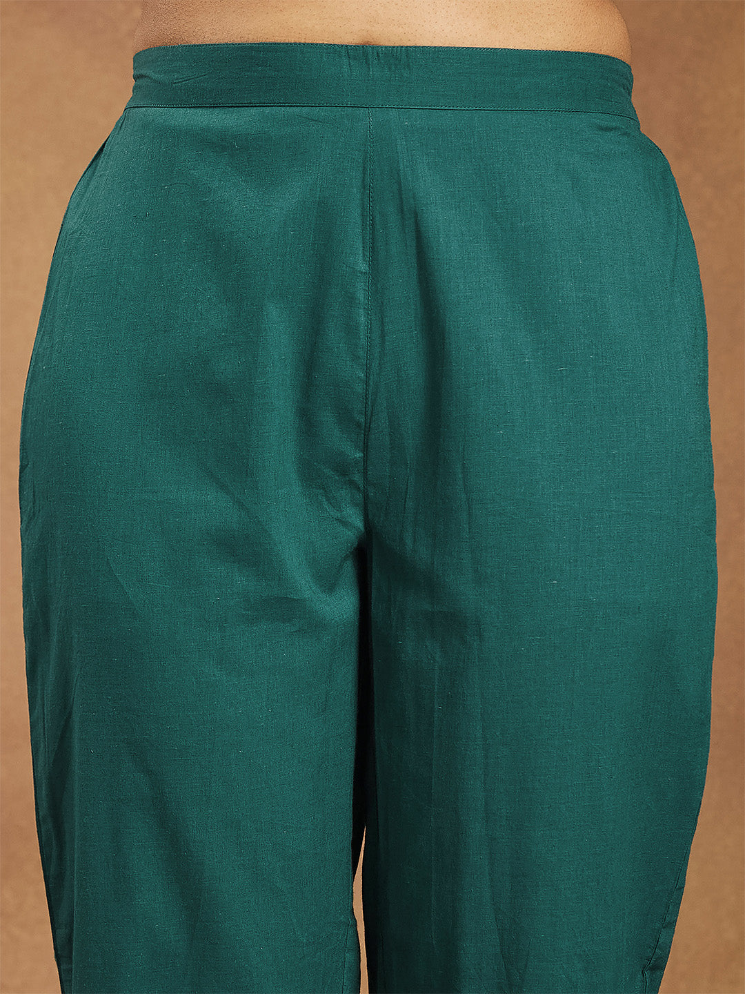 - Elevate your ethnic wardrobe with this stunning teal green pure cotton anarkali set from Janasya. Featuring an anarkali silhouette, the kurta is adorned with elegant floral prints and detailed with intricate zari, sequin, and gota patti lace on the yoke. The notch neckline and three-quarter sleeves with silver gota patti lace add a refined touch, while a functional side pocket adds convenience. Paired with a pure cotton solid narrow green pant, a flowy chiffon dupatta in ombré cream and sage green finished with delicate gota lace at the border and a matching printed scrunchie, the set ensures style and comfort. Perfect for festive and semi-formal occasions.