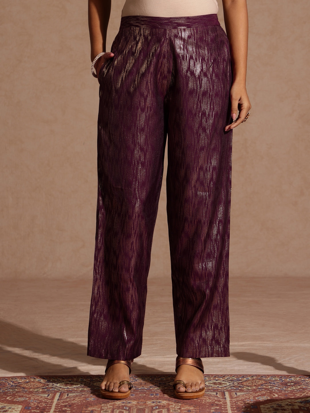 - Embrace festive elegance with this stunning wine a-line kurta set by Janasya. Crafted from luxurious chanderi silk fabric, the kurta features a flattering v-neckline adorned with intricate gold zari and sequin detailing on the yoke. Designed with three-quarter gathered sleeves and soft gathers at the waist for a relaxed fit, it falls gracefully below the knee. Paired with straight chanderi silk pants showcasing subtle gold foil print, a semi-elasticated waist, and a convenient pocket, the set ensures both comfort and style. A matching solid wine chiffon dupatta with delicate gold lace completes the look—perfect for celebrations and special occasions.