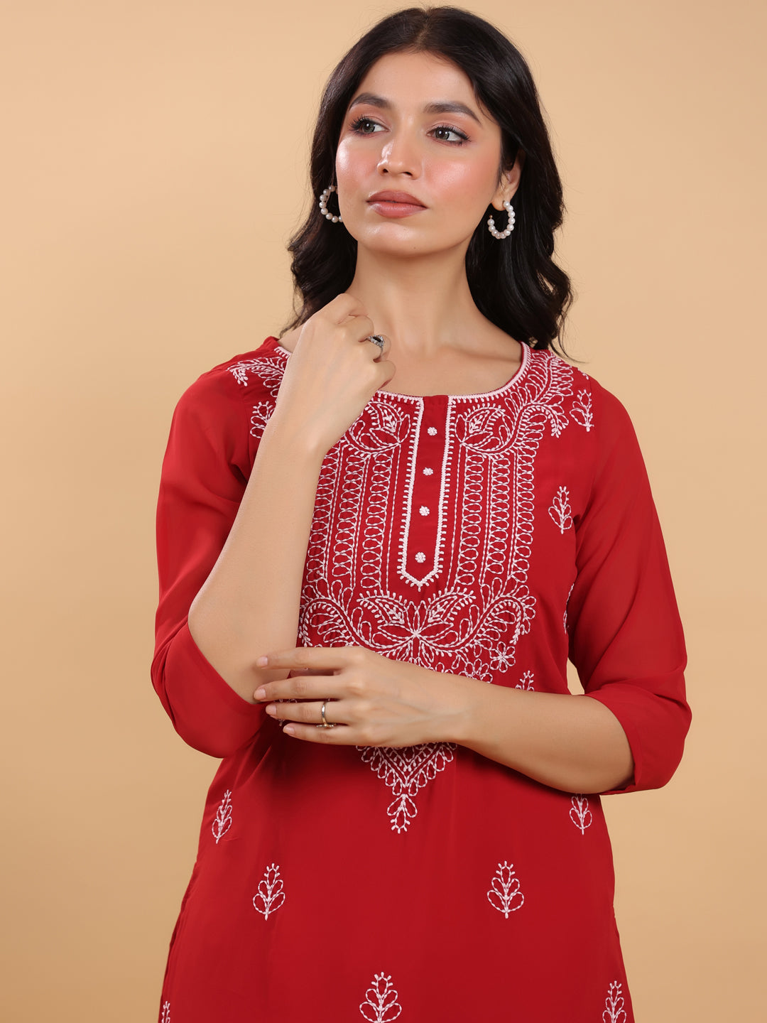 - Janasya’s Maroon Georgette Embroidered Straight Kurta is ideal for your winter wonderland. The straight kurta is crafted from georgette, featuring intricate embroidery on the yoke and front panel. Perfect as casual wear, you can pair this with white bottoms for an elegant fit.
