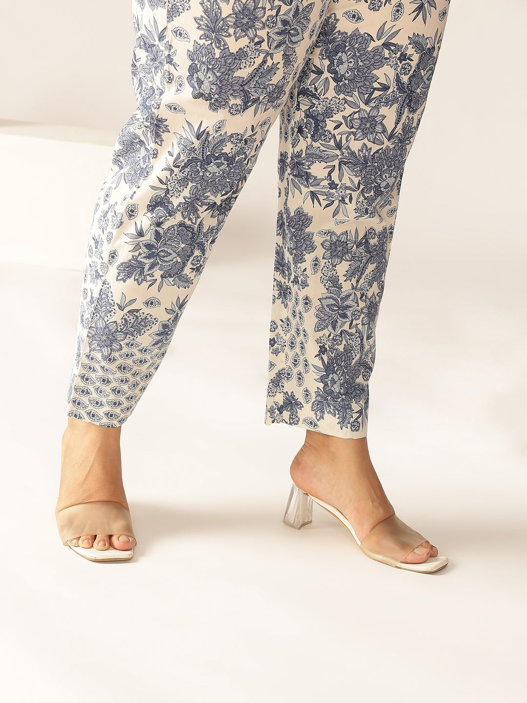 - Refresh your wardrobe with this off-white and blue pure cotton floral printed a-line kurta bottom set. The off-white kurta, adorned with blue floral prints, features a flattering v-neck with delicate lace inserts and stylish balloon sleeves. Easy to slip on with no closure, this set comes with matching narrow pants for a complete, graceful look. Perfect for everyday elegance.