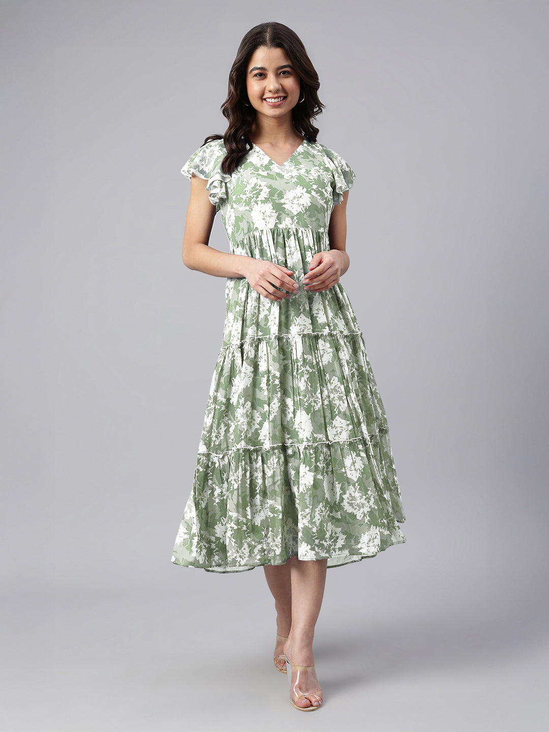 - Step into summer with this sage green georgette tiered dress. Featuring a chic v-neck and short flutter sleeves, its feminine abstract print is effortlessly stylish. The cinched waist flows into a flared, tiered skirt, offering a flattering silhouette. Lined with soft butter crepe, this dress is perfect for a breezy and cute summer look.